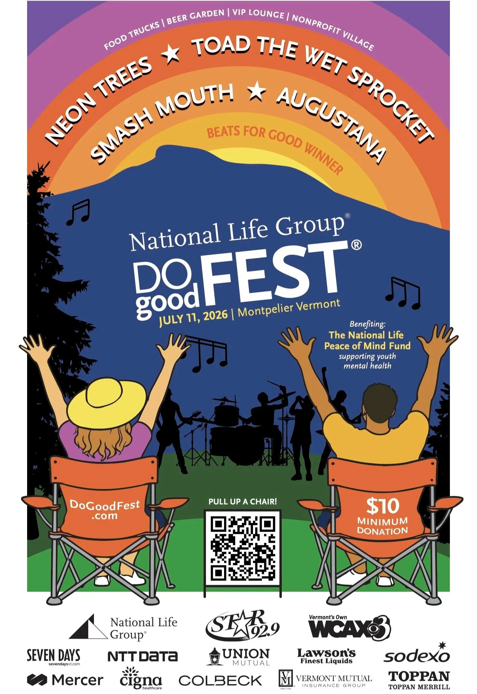 Saturday, July 11, 2026A family-friendly benefit concertfor youth mental health on ourfront lawn in Montpelier, VT Featured Neon Trees, Toad the Wet Sprocket, Smash Mouth, and Augustana to play the 2026 National Life Group Do Good Fest® Read More → A sold out Do Good Fest raises over $214k for Vermont Foodbank Read More → Sponsors and Partners